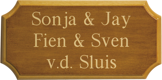 Het hout dat voor de meeste modellen gebruikt wordt is een zachte houtsoort (1-2 cm dikte) welke uitstekend geschikt is om goed in te graveren. Uw naam zal door de graveerwijze niet weg slijten of vervagen. De tekst wordt niet ingekleurd. Deze is bij alle houten naamborden een naturel houtkleur. U kunt uw houten naambord heel eenvoudig met een klein beetje montagekit op vrijwel elke achtergrond monteren. Hout is een bijzonder natuurproduct en daardoor gevoeliger voor de weersomstandigheden dan harde materialen als de kunststof- en metaalsoorten. Achterin de catalogus treft u ook teakhouten naamborden aan die veel sterker en beter geschikt voor de weersomstandigheden zijn. Tot slot: alle houten naamborden worden zonder bevestigingsmateriaal geleverd. Hout: puur natuur!