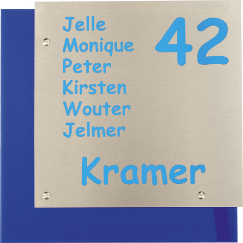 RVS is een zeer sterke staalsoort, welke uitstekend geschikt is voor gebruik in en rondom uw woning. RVS staat voor roest-vast-staal en is daardoor bijzonder weersbestendig, maar niet geheel vrij van onderhoud. Daarom dient uw RVS-naambord af en toe met HG snelglans (te verkrijgen bij de doe-het-zelf vakman en/of bouwmarkt) behandeld te worden. Het is niet verstandig de RVS-naamborden te poetsen, doordat de tekst op alle RVS-naamborden beletterd wordt; zo kan de tekstlaag niet beschadigen of vervagen, indien u geen belettering wenst, dient dit aan te geven in de opmerkingen, wij voorzien dan het naambord van een lasergravure, deze is altijd antraciet/zwart. Tot slot: alle RVS-naamborden worden standaard geleverd met RVS-bevestigingsmateriaal om zo oxidatie bij de schroefgaten tegen te gaan. (N.B. Bovenstaande geldt ook voor alle aluminium en RVS-look naamborden 1400/1500 serie met de uitzondering dat deze naamborden standaard zonder schroefgaten, maar zelfklevend geleverd worden). RVS uniek materiaal, geschikt voor allerlei stijlen, dat tegen een stootje kan!